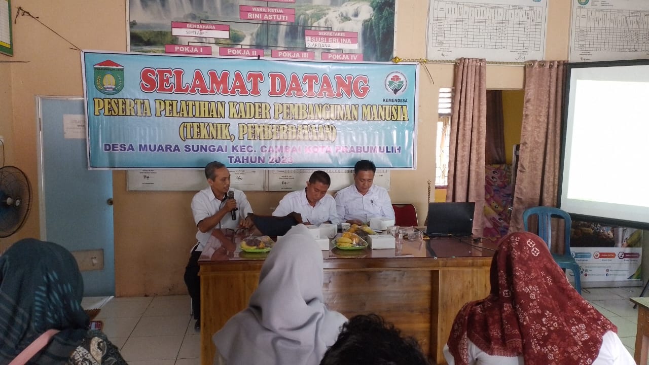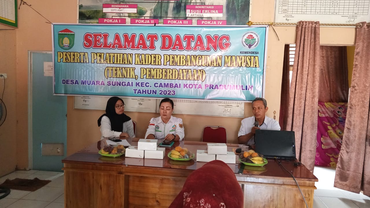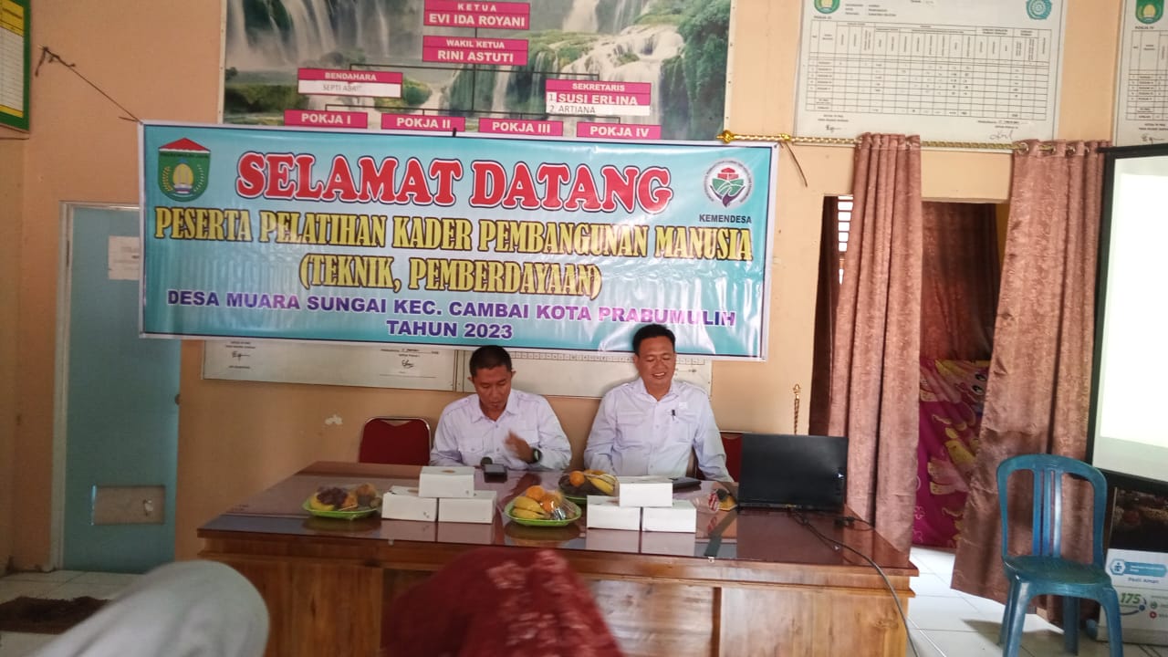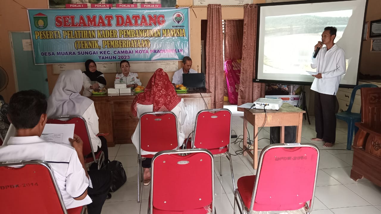 Prabumulih, 27 Desember 2023 Pelatihan Kader Pembangunan Manusia (Teknik, Pemberdayaan) di Desa Muara Sungai Kecamatan Cambai Kota Prabumulih. Kegiatan tersebut dilaksanakan di Kantor Desa Muara Sungai.