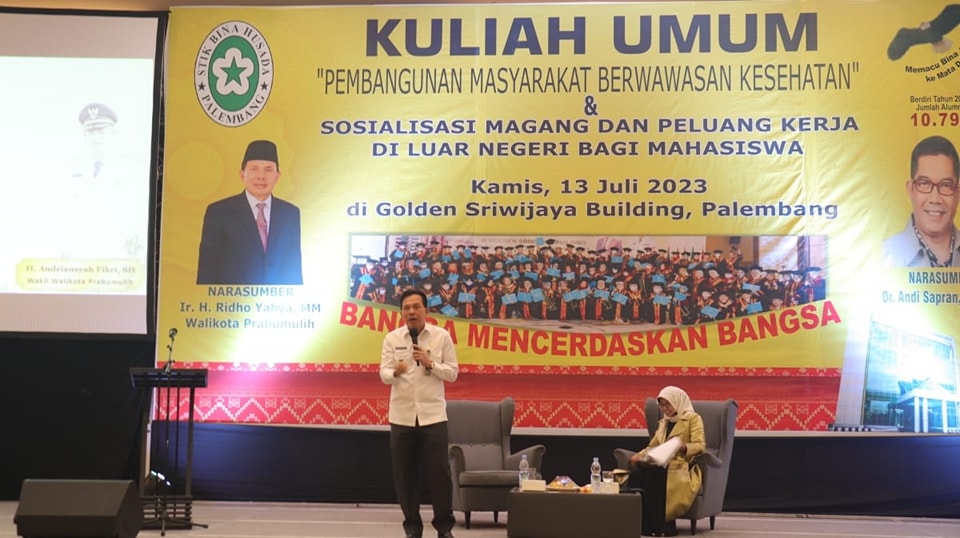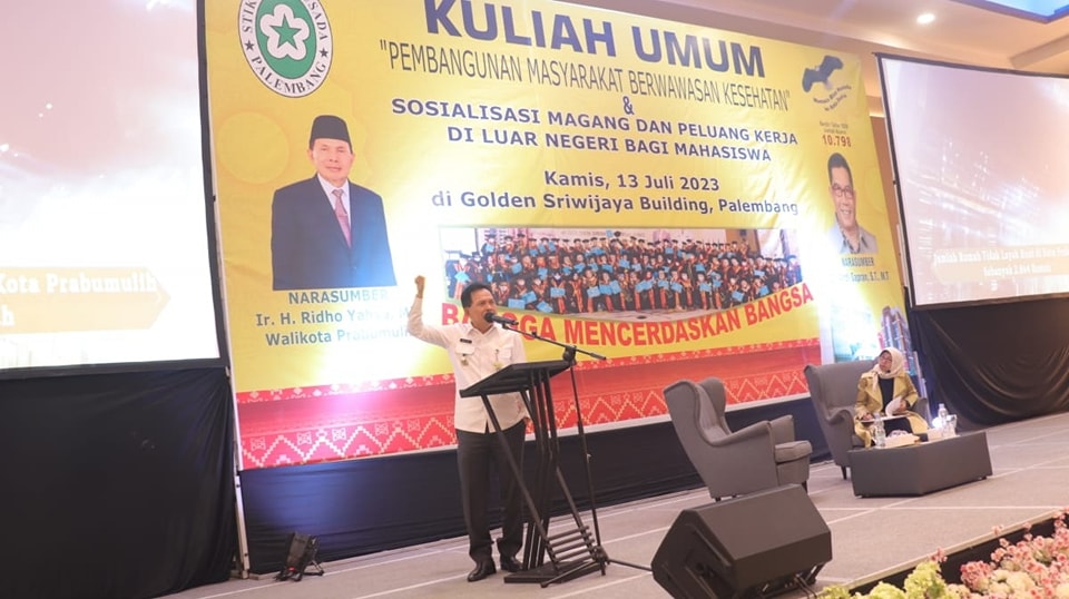 Atas undangan STIK Bina Husada Palembang, Walikota Prabumulih Ir. H. Ridho Yahya, MM hadir sebagai narasumber kuliah umum bagi 973 mahasiswa baik yang diikuti secara langsung (tatap muka) maupun secara daring dari berbagai program studi dengan tema 'Pembangunan Masyarakat Berwawasan Kesehatan & Sosialisasi Magang Dan Peluang Kerja Di Luar Negeri Bagi Mahasiswa', Kamis (13-7-2023).Kegiatan kuliah umum itu dihadiri oleh Ketua Yayasan Bina Husada Palembang Drs. M. Ali Yusuf, Ketua STIK Bina Husada Palembang Ersita,S.Kep,Ners,M.Kes, Kepala Prodi dan Kepala Unit, Dosen, juga para mahasiswa STIK Bina Husada di Golden Sriwijaya Building Palembang serta para jajaran OPD Pemerintah Kota Prabumulih.Ketua Yayasan Bina Husada Palembang Drs. M. Ali Yusuf menerangkan bahwa kuliah umum adalah kegiatan yang tujuannya menambah pengetahuan mahasiswa, karena secara langsung di kuliah umum ini materi disampaikan oleh narasumber yang hebat dan ahli dalam bidangnya. 'Ini ajang bagi mahasiswa dan juga dosen untuk menambah wawasan. Apa yang nanti disampaikan jangan hanya dicatat tetapi benar-benar diterapkan dan diambil nilai positifnya ,'tutupnya.Sementara itu, Walikota Prabumulih Ir. H. Ridho Yahya,MM yang tengah memberikan materi di Kuliah Umum itu menyampaikan bahwa pemimpin Milenial merupakan pemimpin yang dapat mensejahterakan masyarakatnya.'Tidak membuat masalah dan tidak meninggalkan masalah, dan selalu berinovasi,'beber orang nomor satu di Kota Nanas.“Materi yang disampaikan oleh Pak Ridho sangat menginspirasi kita semua dan bermanfaat. Semua orang bisa menagkap dan merekam informasi yang telah disampaikan,' ujar Eka Brianita Mahasiswa Prodi S1 Keperawatan. 'Untuk program-program pak Ridho Yahya sendiri menurut saya pribadi sangat luar biasa. Inovasi yang sudah beliau terapkan di Kota Prabumulih dapat dikatakan berhasil. Program-programnya banyak membantu masyarakat. Semoga bisa diterapkan ,”tutup Nadia Forenza Mahasiswa D3 Kebidanan.